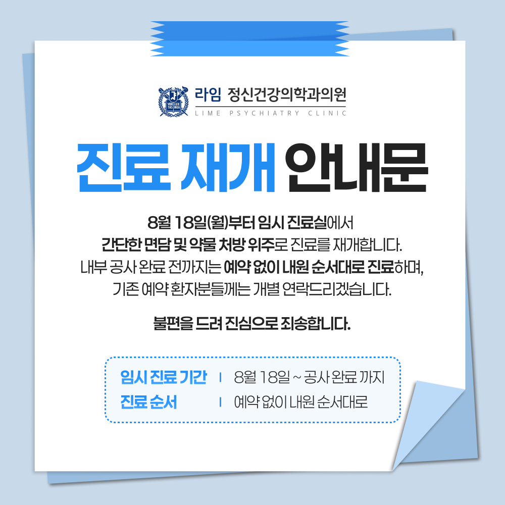 다만, 장기간 진료를 미룰 수 없기에  “여름 휴가 기간이 끝나는 2025년 8월 18일(월요일)”부터는 임시 진료실을 마련하여 간단한 면담 및 약물 처방 위주로 진료를 재개합니다.
